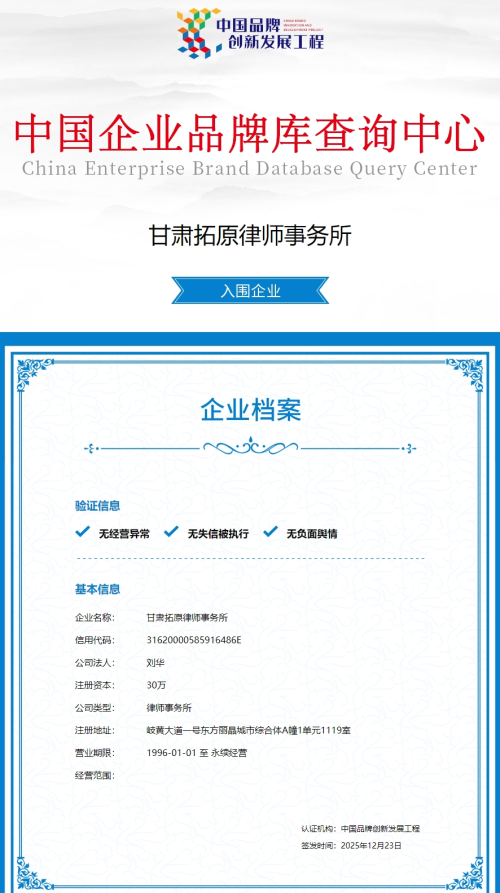 此次入围事件,不仅为甘肃拓原律师事务所带来了更广阔的品牌发展空间,更将为甘肃法律服务行业的品牌化升级提供重要借鉴,推动更多陇原法律品牌在专业化、规范化、创新化的道路上稳步前行,为中国法治品牌建设贡献甘肃力量。